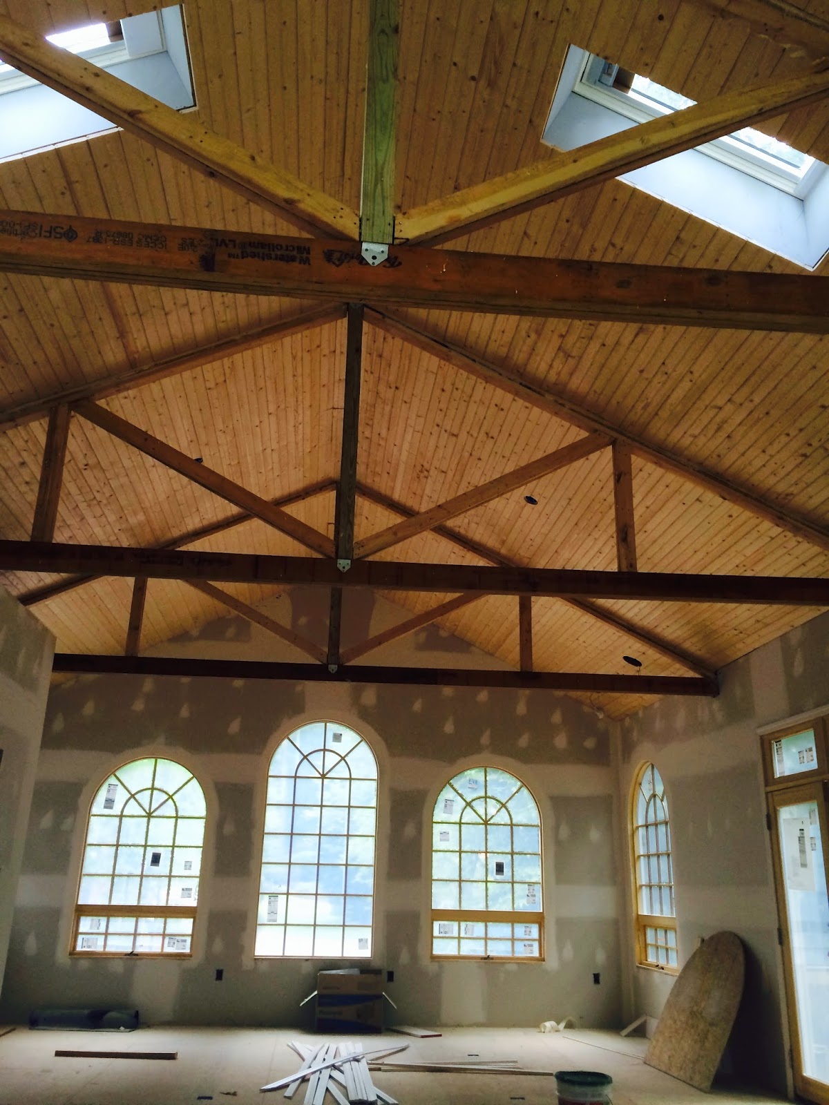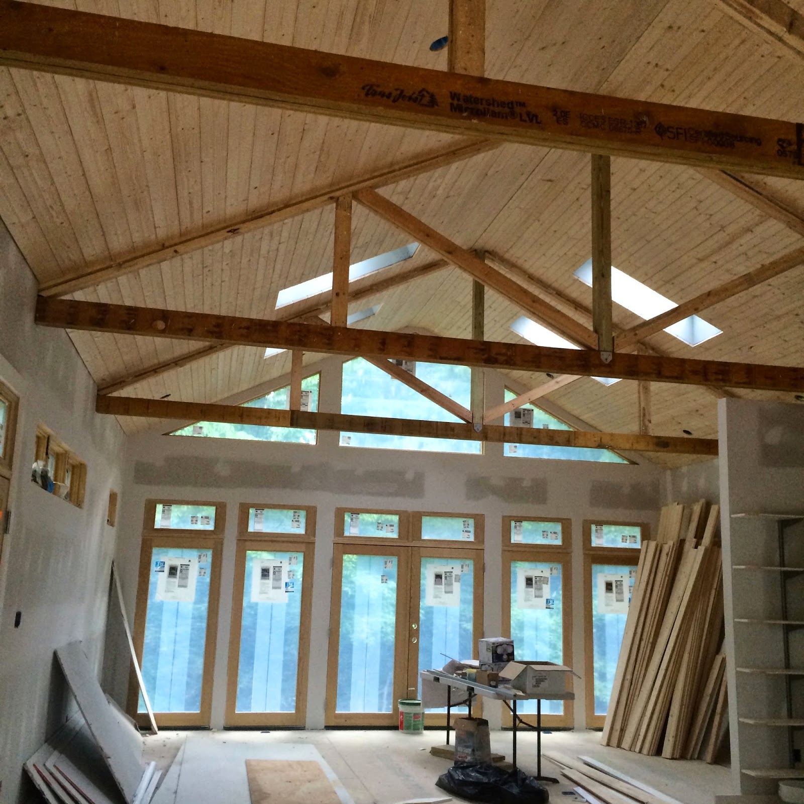 Until today, progress has been mostly one step forward and two steps back for months. The contractor made several arbitrary decisions that couldn't afford to be undone. Fortunately, others have been resolved. For example, ugly lighting boxes built out from the wood ceiling have been removed, recessed and hidden; boxy cladding has been removed from the beams; standard fake-wood molding has been removed from around the windows and the windows smoothed into the walls as originally requested. The real-wood baseboard-molding battle has gone on for weeks as I insist on my simple but not standard stacking idea.